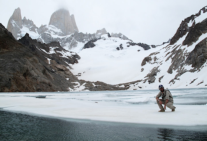 Au pied du Fitz Roy, la laguna de los tres, quasiment gelée, il fait froid et on peut y distinguer des icebergs qui s’y prélassent lascivement comme des gros phoques. Ju et moi montons dessus sans vérifier la solidité au préalable, sinon c’est pas drôle.