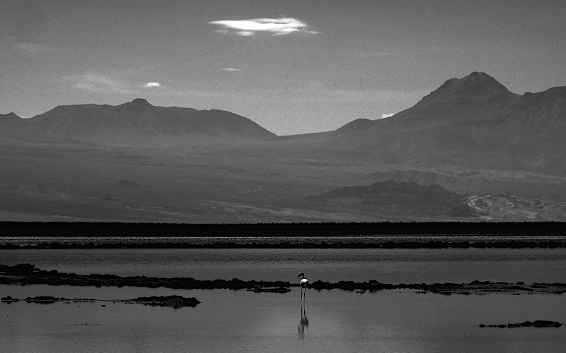 Prenant soin de prélever des cures dents pour le soir, nous prenons le temps d’observer le coucher de soleil puis allons manger. Nous retrouvons nos compagnons de voyage à table, l’allemand à acheté une bouteille de vin chilien qui donne fort à faire au vin de table bolivien à propos duquel je préfère taire tout commentaire (sinon que j’ai vomi un peu dans ma bouche). Le menu est à base de flamant rose, et c’est de la bonne volaille surtout accompagné de l’excellent vin chilien.