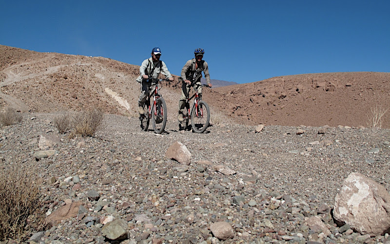Nous nous arrêtons à un lac dont l’eau est jaunâtre à cause du souffre probablement, mais plein de vie, dont des flamants roses et des mouettes et d’autres trucs avec des nageoires probablement. Au rythme de l’Ipod de Julien, nous continuerons notre route sans s’intéresser plus que ça aux magnifiques lacs des altiplanos boliviens. On avait déjà les photos. Nous croisons un cycliste, seul cette fois, qui était parti du Venezuela et allait jusqu’à San Pedro de Atacama, son calvaire semblait arriver à sa fin mais il peinait horriblement dans le sable mou et nous avions pitié de lui du haut de notre tout-terrain qui progressait aisément dans ce paysage hostile (bicyclettement parlant). L’Ipod de Ju passe enfin du metal, et je suis comme par hasard le seul à en profiter. Il enchaîne ensuite sur Infinity ce qui ne m’empêchera pas de headbanger comme si c’était du brutal death.