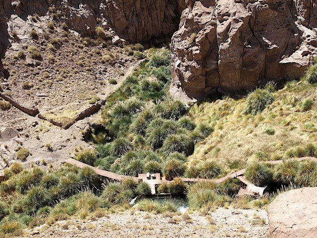 Nous enchainons ensuite notre voyage et arrivons aux termes de chaipasquoi. Bref des eaux thermales dans lesquelles je ne me suis pas baigné puisqu’il était interdit d’y jeter du détergent et aussi parce que mes coups de soleil me brulent déjà assez comme ça. Donc je regarde tout le monde se baigner dans une eau plus chaude que celle des thermes d’hier. Bizarrement personne n’a l’air d’avoir froid en sortant malgré le vent. Le paysage des thermes me rappelle celui des marées basses de Normandie, je crois que la France me manque malgré tout après tout ce temps. Aux thermes, nous croisons deux cyclistes venant de la Colombie et comptant aller jusqu’en Patagonie. Ils étaient partis il y a 3 mois. C’est une aventure que j’aimerai beaucoup faire, je veux dire quand je saurai faire du vélo.